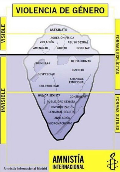El iceberg representa de una manera gráfica y metafórica cómo se van erigiendo, sobre una base invisible y naturalizada de prácticas violentas, otras formas de violencias visibles y más extremas. Las VBG y diversidades no son un problema individual (de una pareja o persona) sino que es un fenómeno social, que atraviesa distintos ámbitos de la vida (Cuadernillo de Ley Micaela en Argentina, 2021).